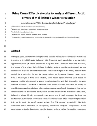 Kretschmer, M. orcid id iconORCID: https://orcid.org/0000-0002-2756-9526, Coumou, D., Donges, J. F. and Runge, J. (2016) Using causal effect networks to analyze different arctic drivers of midlatitude winter circulation. Journal of Climate, 29 (11). pp. 4069-4081. ISSN 1520-0442 doi: 10.1175/JCLI-D-15-0654.1