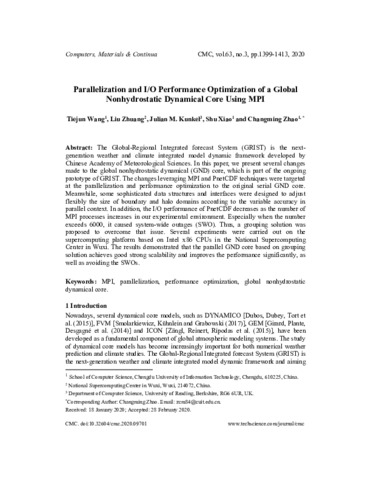 Wang, T., Zhuang, L., Kunkel, J., Xiao, S. and Zhao, C. (2020) Parallelization and I/O performance optimization of a global nonhydrostatic dynamical core using MPI. Computers, Materials & Continua, 63 (3). pp. 1399-1413. ISSN 1546-2226 doi: 10.32604/cmc.2020.09701