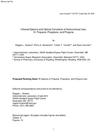 Hudson, R. L., Gerakines, P. A., Yarnall, Y. Y. and Coones, R. T. orcid id iconORCID: https://orcid.org/0000-0001-6651-4707 (2021) Infrared spectra and optical constants of astronomical ices: III. Propane, propylene, and propyne. Icarus, 354. 114033. ISSN 0019-1035 doi: 10.1016/j.icarus.2020.114033