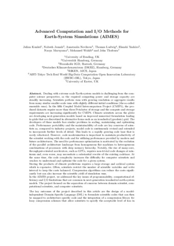 Kunkel, J., Jumah, N., Novikova, A., Ludwig, T., Yashiro, H., Maruyama, N., Wahib, M. and Thuburn, J. (2020) AIMES: advanced computation and I/O methods for earth-system simulations. Software for Exascale Computing - SPPEXA 2016-2019. Lectures Notes in Computational Science and Engineering (136). pp. 61-102. ISSN 1439-7358 doi: 10.1007/978-3-030-47956-5_5