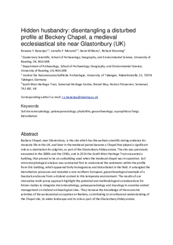 Banerjea, R. Y. orcid id iconORCID: https://orcid.org/0000-0002-1786-357X, Morandi, L. F., Williams, K. and Brunning, R. (2021) Hidden husbandry: disentangling a disturbed profile at Beckery Chapel, a medieval ecclesiastical site near Glastonbury (UK). Environmental Archaeology: The Journal of Human Palaeoecology, 26 (4). pp. 367-387. ISSN 1461-4103 doi: 10.1080/14614103.2020.1768333