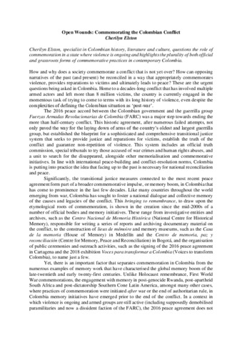 Elston, C. orcid id iconORCID: https://orcid.org/0000-0002-0623-0187 (2020) Open wounds: commemorating the Colombian conflict. In: Gilbert, C., McLoughlin, K. and Munro, N. (eds.) On commemoration: global reflections upon remembering war. Peter Lang, Oxford. ISBN 9781788749404 doi: 10.3726/b14904