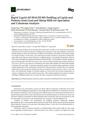 Rapid liquid AP-MALDI MS profiling of lipids and proteins from goat and sheep milk for speciation and colostrum analysis.