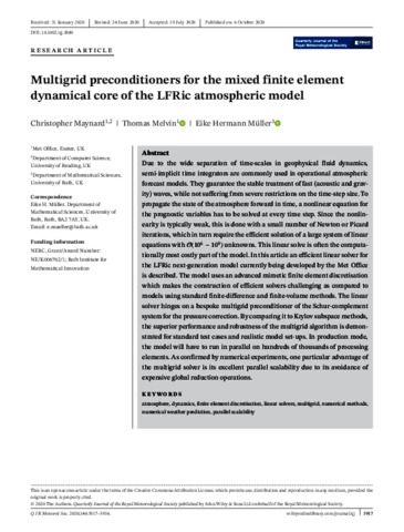Maynard, C., Melvin, T. and Mueller, E. (2020) Multigrid preconditioners for the mixed finite element dynamical core of the LFRic atmospheric model. Quarterly Journal of the Royal Meteorological Society, 146 (733). pp. 3917-3936. ISSN 1477-870X doi: 10.1002/qj.3880