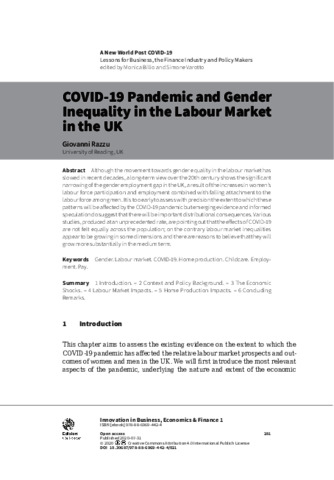 Razzu, G. orcid id iconORCID: https://orcid.org/0000-0003-2640-8314 (2020) Covid-19 pandemic and gender inequality in the labour market in the UK. In: Billio, M. and Varotto, S. (eds.) A New World Post COVID-19 Lessons for Business, the Finance Industry and Policy Makers. Ca Foscari University Press, Venice, Italy. ISBN 9788869694424 doi: 10.30687/978-88-6969-442-4/021