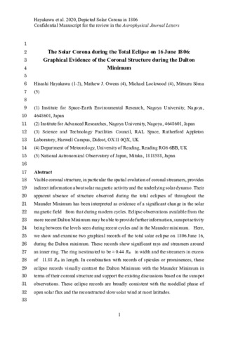 Hayakawa, H. orcid id iconORCID: https://orcid.org/0000-0001-5370-3365, Owens, M. orcid id iconORCID: https://orcid.org/0000-0003-2061-2453, Lockwood, M. orcid id iconORCID: https://orcid.org/0000-0002-7397-2172 and Sôma, M. (2020) The solar corona during the total eclipse on 1806 June 16: graphical evidence of the coronal structure during the Dalton minimum. The Astrophysical Journal, 900 (2). p. 114. ISSN 1538-4357 doi: 10.3847/1538-4357/ab9807