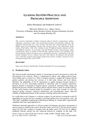 Maroukian, K. and Gulliver, S. orcid id iconORCID: https://orcid.org/0000-0002-4503-5448 (2020) Leading Devops practice and principle adoption. In: 9th International Conference on Information Technology Convergence and Services (ITCSE ’20)., 30-31 May 2020, Vancouver, Canada.