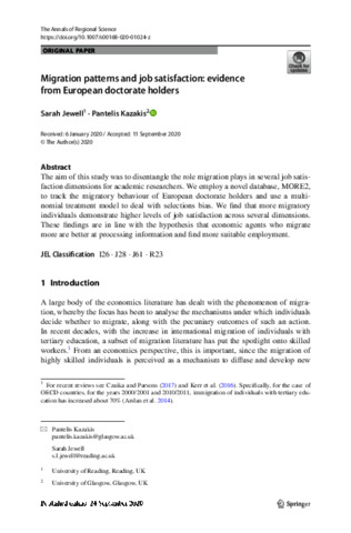 Jewell, S. orcid id iconORCID: https://orcid.org/0000-0002-4413-6618 and Kazakis, P. (2021) Migration patterns and job satisfaction: evidence from European doctorate holders. Annals of Regional Science, 66. pp. 359-407. ISSN 0570-1864 doi: 10.1007/s00168-020-01024-z