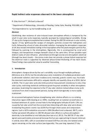 Harrison, G. orcid id iconORCID: https://orcid.org/0000-0003-0693-347X and Lockwood, M. orcid id iconORCID: https://orcid.org/0000-0002-7397-2172 (2020) Rapid indirect solar responses observed in the lower atmosphere. Proceedings of the Royal Society A: Mathematical, Physical and Engineering Sciences, 476 (2241). 20200164. ISSN 1364-5021 doi: 10.1098/rspa.2020.0164