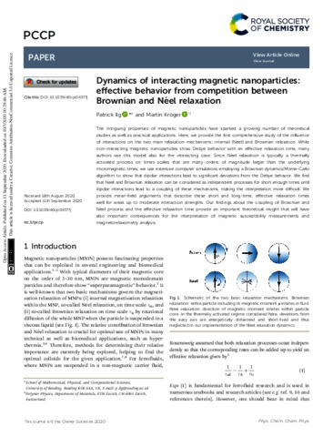 Kroeger, M. and Ilg, P. orcid id iconORCID: https://orcid.org/0000-0002-7518-5543 (2020) Dynamics of interacting magnetic nanoparticles: effective behavior from competition between Brownian and Néel relaxation. Physical Chemistry Chemical Physics, 22 (39). pp. 22244-22259. ISSN 1463-9076 doi: 10.1039/D0CP04377J