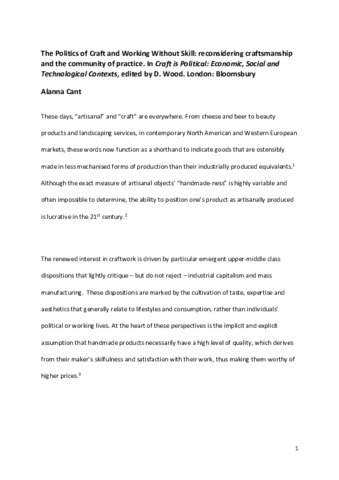 Cant, A. orcid id iconORCID: https://orcid.org/0000-0002-7549-0062 (2021) The politics of craft and working without skill: reconsidering craftsmanship and the community of practice. In: Wood, D. (ed.) Craft is Political. Bloomsbury Visual Arts (1). Bloomsbury, London. ISBN 9781350122284
