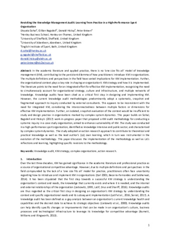 Sohal, D., Ragsdell, G., Hislop, D. and Brown, P. (2020) Revisiting the knowledge management audit: learning from practice in a high-performance sport organisation. In: European Conference on Knowledge Management, 2-4 Dec 2020, Coventry, UK.