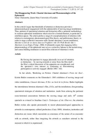 The disappearing work: Chantal Akerman and phenomenologies of the ephemeral.