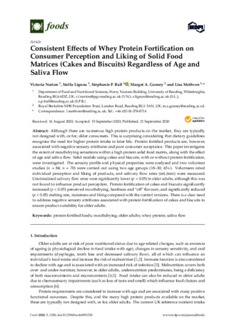 Norton, V. orcid id iconORCID: https://orcid.org/0000-0002-1961-2539, Lignou, S. orcid id iconORCID: https://orcid.org/0000-0001-6971-2258, Bull, S. P. orcid id iconORCID: https://orcid.org/0000-0001-5129-1731, Gosney, M. A. and Methven, L. (2020) Consistent effects of whey protein fortification on consumer perception and liking of solid food matrices (cakes and biscuits) regardless of age and saliva flow. Foods, 9 (9). 1328. ISSN 2304-8158 doi: 10.3390/foods9091328