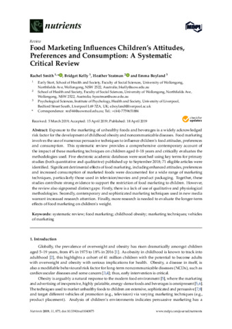 Smith, R. orcid id iconORCID: https://orcid.org/0000-0002-1546-3847, Kelly, B., Yeatman, H. orcid id iconORCID: https://orcid.org/0000-0002-5529-4689 and Boyland, E. (2019) Food marketing influences children’s attitudes, preferences and consumption: a systematic critical review. Nutrients, 11 (4). 875. ISSN 2072-6643 doi: 10.3390/nu11040875