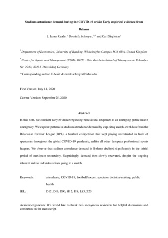 • Reade, J. J., & Singleton, C. (2020). Demand for Public Events in the COVID-19 Pandemic: A Case Study of European Football (No. em-dp2020-09). Henley Business School, Reading University.