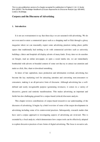 It is not an overstatement to say that these days we are saturated with advertising. We do not even need to enter a commercial space such as a shopping mall or flick through a glossy magazine where we can reasonably expect some advertising practices taking place; public spaces that traditionally had nothing to do with commercial activities such as university buildings, clinics and hospitals all display adverts of many kinds. Every time we do searches on Google, read an online newspaper, or open a social media site, we are immediately bombarded with adverts or branded content of some sort that try to attract our attention and make us click, like, share or download something. In times of late capitalism, mass production and information overload, advertising has become the key marketing tool for attracting attention and converting non-consumers to consumers, making it an all-pervasive form of discourse. Although advertising has a well-defined and easily recognizable purpose (generating revenues), it comes in a variety of discursive, generic and semiotic manifestations. This makes advertising an important and fertile but also challenging ground for a corpus-based (critical) discourse analysis. This chapter reviews contributions of corpus-based research to our understanding of the discourse of advertising. It begins by a brief overview of some of the major developments in advertising including some of its controversial practices. Subsequently, research studies that have used a corpus approach to investigating aspects of advertising are reviewed. This is extended by a focal analysis, which demonstrates how corpus tools can be effectively adopted to explore discursive practices of new forms of digital advertising. The focus is on native ads. The chapter concludes with observations regarding opportunities and limitations of a corpus-based discourse analysis to study advertising and discusses avenues for future research.