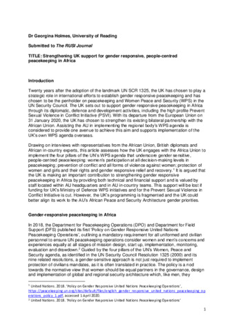 Holmes, G. (2020) Strengthening UK support for gender responsive, people-centred peacekeeping in Africa. RUSI Journal, 165 (5-6). pp. 36-45. ISSN 1744-0378 doi: 10.1080/03071847.2020.1844593