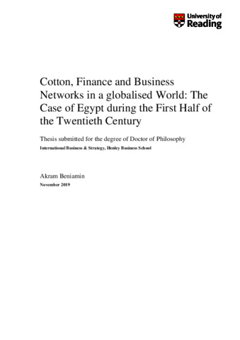 Beniamin, A. (2020) Cotton, finance and business networks in a globalised world: the case of Egypt during the first half of the Twentieth Century. PhD thesis, University of Reading. doi: 10.48683/1926.00093435