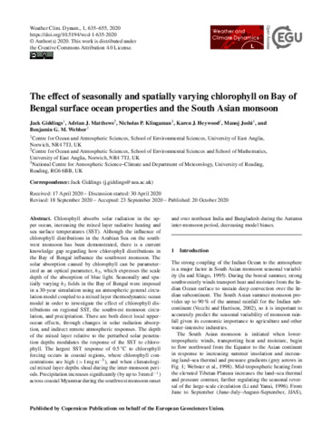 The effect of seasonally and spatially varying chlorophyll on Bay of Bengal surface ocean properties and the South Asian Monsoon.