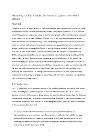 This paper explores how past notions of idyllic rural dwelling were mobilised and enacted during the implementation of the UK Land Settlement Association (LSA) scheme established in 1934. The LSA was a UK Government programme set up to resettle unemployed workers from depressed industrial urban areas to the countryside. Between 1934 and 1939, 1,100 smallholdings were established within 20 settlements across the country. These smallholdings were run as cooperatives, but many failed when relocated families complained of long hours, low pay and isolation. Recruitment to the scheme ceased at the outbreak of World War II, with the settlements being fully dissolved and privatised in 1983. By drawing on a unique archive housed in the Museum of English Rural Life (MERL), analysis centres on how the LSA represented and promoted rural living to settlers and the wider public. The paper illuminates three overlapping but distinct elements to this project: the production of physical space as a setting that has been designed to bring about particular forms of behaviour and community cohesion; notions of labour, independence of spirit and reconnecting with the land; and building the physiques of men through hard work, fresh air and good food, thus improving the national stock. The findings demonstrate the power of the rural idyll in producing particular forms of sociality, belonging and masculinity, with many of the ideas that undergirded the LSA continuing to resonate today.