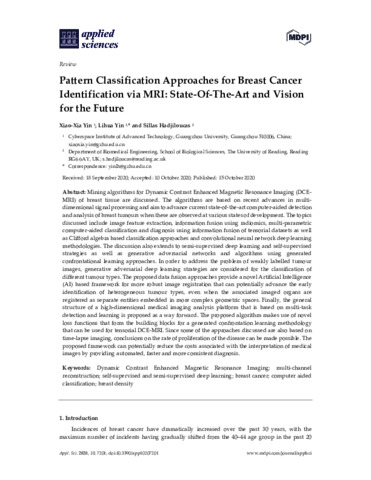 Yin, X.-X., Yin, L. and Hadjiloucas, S. orcid id iconORCID: https://orcid.org/0000-0003-2380-6114 (2020) Pattern classification approaches for breast cancer identification via MRI: state‐of‐the‐art and vision for the future. Applied Sciences, 10 (20). 7201. ISSN 2076-3417 doi: 10.3390/app10207201