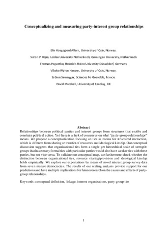 Relationships between political parties and interest groups form structures that enable and constrain political action. Yet there is a lack of consensus on what ‘party-group relationships’ means. We propose a conceptualization focusing on ties as means for structured interaction, which is different from sharing or transfer of resources and ideological kinship. Our conceptual discussion suggests that organizational ties form a single yet hierarchical scale of strength: groups that have many formal ties with particular parties would also have weaker ties with these parties, but not vice versa. To validate our conceptual map, we furthermore check whether the distinction between organizational ties, resource sharing/provision and ideological kinship holds empirically. We explore our expectations by means of novel interest group survey data from seven mature democracies. The results of our scaling analysis provide support for our predictions and have multiple implications for future research on the causes and effects of party-group relationships.