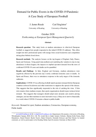 • Reade, J. J., Schreyer, D., & Singleton, C. (2020). Stadium attendance demand during the Covid-19 crisis: Early empirical evidence from Belarus. Applied Economics Letters, In press.