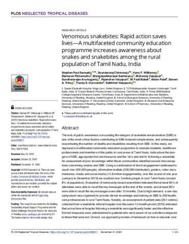 Samuel, S. P., Chinnaraju, S., Williams, H., Pichamuthu, E., Subharao, M., Vaiyapuri, M., Arumugam, S., Vaiyapuri, R., Baksh, F. orcid id iconORCID: https://orcid.org/0000-0003-3107-8815, Patel, K., Trim, S., Duncombe, T. orcid id iconORCID: https://orcid.org/0000-0003-4746-4470 and Vaiyapuri, S. orcid id iconORCID: https://orcid.org/0000-0002-6006-6517 (2020) Venomous snakebites: rapid action saves lives - a multifaceted community education programme increases awareness about snakes and snakebites among the rural population of Tamil Nadu, India. PLoS Neglected Tropical Diseases, 14 (12). e0008911. ISSN 1935-2735 doi: 10.1371/journal.pntd.0008911