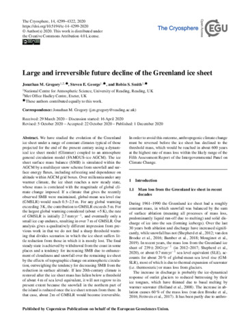 We have studied the evolution of the Greenland ice-sheet under a range of constant climates typical of those projected for the end of the present century, using a dynamical ice-sheet model (Glimmer) coupled to an atmospheric general circulation model (FAMOUS-ice AGCM). The ice-sheet surface mass balance (SMB) is simulated by the AGCM, including its dependence on altitude within AGCM gridboxes. Over millennia under a warmer climate, the ice-sheet reaches a new steady state, whose mass is correlated with the initial perturbation in SMB, and hence with the magnitude of global climate change imposed. For the largest global warming considered (about +5 K), the contribution to global-mean sea-level rise (GMSLR) is initially 2.7 mm yr−1, and the ice-sheet is eventually practically eliminated (giving over 7 m of GMSLR). For all RCP8.5 climates, final GMSLR exceeds 4 m. If recent climate were maintained, GMSLR would reach 1.5–2.5 m. Contrary to expectation from earlier work, we find no evidence for a threshold warming that divides scenarios in which the ice-sheet suffers little reduction from those which it is mostly lost. This is because the dominant effect is reduction of area, not reduction of surface altitude, and the geographical variation of SMB must be taken into account. The final steady state is achieved by withdrawal from the coast in some places, and a tendency for increasing SMB due to enhancement of cloudiness and snowfall over the remaining ice-sheet, through the effects of topographic change on atmospheric circulation. If late twentieth-century climate is restored, the ice-sheet will not regrow to its present extent, owing to such effects, once its mass has fallen below a threshold of about 4 m of sea-level equivalent. In that case, about 2 m of GMSLR would become irreversible. In order to avoid this outcome, anthropogenic climate change must be reversed before the ice-sheet has declined to the threshold mass, which would be reached in about 600 years at the highest rate of mass-loss within the likely range of the Fifth Assessment Report of the Intergovernmental Panel on Climate Change.