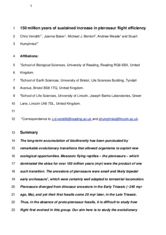 The long-term accumulation of biodiversity has been punctuated by remarkable evolutionary transitions that allowed organisms to exploit new ecological opportunities. Mesozoic flying reptiles (the pterosaurs), which dominated the skies for more than 150 million years, were the product of one such transition. The ancestors of pterosaurs were small and probably bipedal early archosaurs1, which were certainly well-adapted to terrestrial locomotion. Pterosaurs diverged from dinosaur ancestors in the Early Triassic epoch (around 245 million years ago); however, the first fossils of pterosaurs are dated to 25 million years later, in the Late Triassic epoch. Therefore, in the absence of proto-pterosaur fossils, it is difficult to study how flight first evolved in this group. Here we describe the evolutionary dynamics of the adaptation of pterosaurs to a new method of locomotion. The earliest known pterosaurs took flight and subsequently appear to have become capable and efficient flyers. However, it seems clear that transitioning between forms of locomotion2,3—from terrestrial to volant—challenged early pterosaurs by imposing a high energetic burden, thus requiring flight to provide some offsetting fitness benefits. Using phylogenetic statistical methods and biophysical models combined with information from the fossil record, we detect an evolutionary signal of natural selection that acted to increase flight efficiency over millions of years. Our results show that there was still considerable room for improvement in terms of efficiency after the appearance of flight. However, in the Azhdarchoidea4, a clade that exhibits gigantism, we test the hypothesis that there was a decreased reliance on flight5,6,7 and find evidence for reduced selection on flight efficiency in this clade. Our approach offers a blueprint to objectively study functional and energetic changes through geological time at a more nuanced level than has previously been possible.