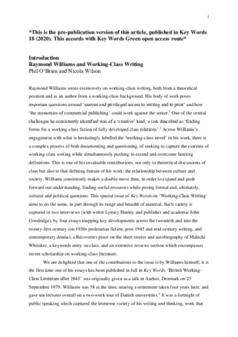 Introduction to a Special Issue of Key Words on Working-Class Writing, co-edited and co-authored with Dr Phil O'Brien. The introduction discusses Williams' theories of working-class writing and his previously unpublished lecture, 'British Working-Class Literature after 1945' (1979) in the context of his other essays on working-class writing. The article goes on to discuss other working-class writers, including Buchi Emecheta and Isabel Waidner, and contemporary publishers endeavouring to support working-class writers today.
