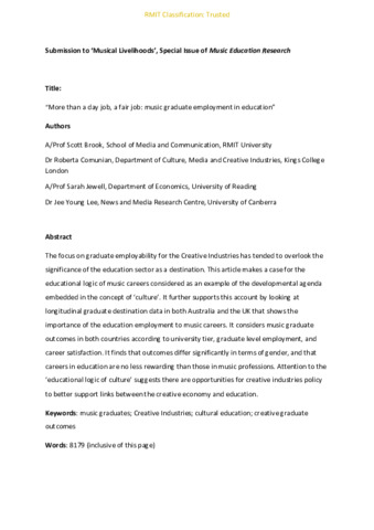 The focus on graduate employability for the Creative Industries has tended to overlook the significance of the education sector as a destination. This article makes a case for the educational logic of music careers considered as an example of the developmental agenda embedded in the concept of ‘culture’. It further supports this account by looking at longitudinal graduate destination data in both Australia and the UK that shows the importance of the education employment to music careers. It considers music graduate outcomes in both countries according to university tier, graduate level employment, and career satisfaction. It finds that outcomes differ significantly in terms of gender, and that careers in education are no less rewarding than those in music professions. Attention to the ‘educational logic of culture’ suggests there are opportunities for creative industries policy to better support links between the creative economy and education.