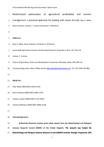 Milne, A. E., Coleman, K., Todman, L. C. orcid id iconORCID: https://orcid.org/0000-0003-1232-294X and Whitmore, A. P. (2020) Model-based optimization of agricultural profitability and nutrient management: a practical approach for dealing with issues of scale. Environmental Monitoring and Assessment, 192. 730. ISSN 0167-6369 doi: 10.1007/s10661-020-08699-z