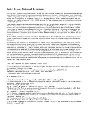 The giant ibis (Thaumatibis gigantea), Cambodia’s national bird, is edging toward extinction. The ibis’s historical range stretched across Southeast Asia, but only 194 critically endangered individuals remain, constrained to the northeastern region of Cambodia. The small population suffers from habitat loss and disturbance caused by human activities, and tensions between humans and wildlife have escalated during the coronavirus disease 2019 (COVID-19) pandemic. In April, 3 giant ibises and more than 100 other birds were poached in Cambodia’s Chhep Wildlife Sanctuary. To save the giant ibis, conservation efforts must continue, even during the pandemic.