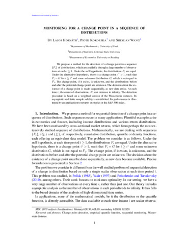 Horváth, L., Kokoszka, P. and Wang, S. orcid id iconORCID: https://orcid.org/0000-0003-2113-5521 (2021) Monitoring for a change point in a sequence of distributions. Annals of Statistics, 49 (4). pp. 2271-2291. ISSN 2168-8966 doi: 10.1214/20-AOS2036