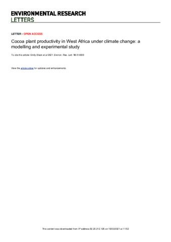 Black, E. orcid id iconORCID: https://orcid.org/0000-0003-1344-6186, Pinnington, E., Wainwright, C. orcid id iconORCID: https://orcid.org/0000-0002-7311-7846, Lahive, F., Quaife, T. orcid id iconORCID: https://orcid.org/0000-0001-6896-4613, Allan, R. P. orcid id iconORCID: https://orcid.org/0000-0003-0264-9447, Cook, P., Daymond, A. orcid id iconORCID: https://orcid.org/0000-0002-7597-9423, Hadley, P., McGuire, P. C. orcid id iconORCID: https://orcid.org/0000-0001-6592-4966, Verhoef, A. orcid id iconORCID: https://orcid.org/0000-0002-9498-6696 and Vidale, P. L. orcid id iconORCID: https://orcid.org/0000-0002-1800-8460 (2021) Cocoa plant productivity in West Africa under climate change: a modelling and experimental study. Environmental Research Letters, 16 (1). 014009. ISSN 1748-9326 doi: 10.1088/1748-9326/abc3f3