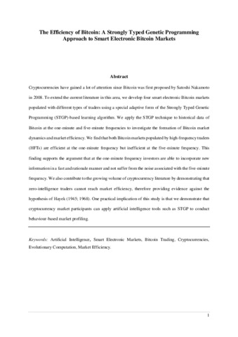 The efficiency of bitcoin: a strongly typed genetic programming approach to smart electronic bitcoin markets.