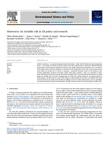 Brimicombe, C., Porter, J. J., Di Napoli, C., Pappenberger, F., Cornforth, R. orcid id iconORCID: https://orcid.org/0000-0003-4379-9556, Petty, C. and Cloke, H. L. orcid id iconORCID: https://orcid.org/0000-0002-1472-868X (2021) Heatwaves: an invisible risk in UK policy and research. Environmental Science & Policy, 116. pp. 1-7. ISSN 1462-9011 doi: 10.1016/j.envsci.2020.10.021
