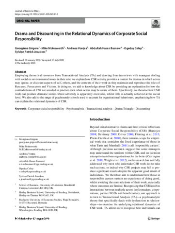 Grigore, G., Molesworth, M., Vonțea, A., Basnawi, A. H., Celep, O. and Sylvian, P. J. (2021) Drama and discounting in the relational dynamics of corporate social responsibility. Journal of Business Ethics, 174 (1). pp. 65-88. ISSN 1573-0697 doi: 10.1007/s10551-020-04591-5