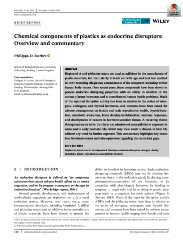 Darbre, P. D. (2020) Chemical components of plastics as endocrine disruptors: overview and commentary. Birth Defects Research, 112 (17). pp. 1300-1307. ISSN 2472-1727 doi: 10.1002/bdr2.1778