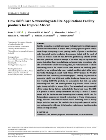 Satellite nowcasting potentially provides a vital opportunity to mitigate against the risks of severe weather in tropical Africa, where population growth and climate change are exposing an ever growing number of people to weather hazards. Numerical weather prediction demonstrates limited skill for much of Africa and weather radars are rare. However, geostationary satellites provide excellent spatial and temporal coverage of the often long‐lasting convective storms that deliver heavy rain, lightning and strong winds, presenting a valuable opportunity for satellite nowcasting. Here, we evaluate the skill of satellite nowcasting products for tropical Africa: these products are routinely generated, but to our best knowledge never routinely used in tropical Africa before the Global Challenges Research Fund African SWIFT (Science for Weather Information and Forecasting Techniques) project. Focusing in particular on convective rainfall rate (CRR) and rapidly developing thunderstorm convection warning (RDT‐CW) products, we demonstrate that both are useful nowcasting tools. The CRR product produces very different rainfall climatologies for day and night in tropical Africa. This is associated with greater skill of the product during daytime, particularly for heavier rain rates. The RDT‐CW product is able to identify around 60% of heavy (>5 mm·hr−1) rainfall events with the fraction detected increasing with increasing rainfall rate. For both products, extrapolation forwards in time (up to 90 and 60 min, respectively) maintains useful skill in tropical Africa, motivating work to develop longer lead‐time nowcasts. We conclude that widespread uptake of satellite nowcasting could provide new skilful weather predictions on short time‐scales in much of tropical Africa.