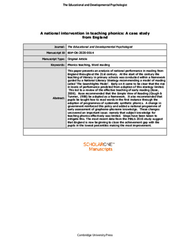 Stainthorp, R. (2020) A national intervention in teaching phonics: a case study from England. The Educational and Developmental Psychologist, 37 (2). pp. 114-122. ISSN 2059-0776 doi: 10.1017/edp.2020.14