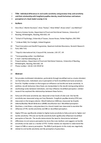 Zhou, X., Yeomans, M., Thomas, A., Wilde, P., Linter, B. and Methven, L. (2021) Individual differences in oral tactile sensitivity and gustatory fatty acid sensitivity and their relationship with fungiform papillae density, mouth behaviour and texture perception of a food model varying in fat. Food Quality and Preference, 90. 104116. ISSN 0950-3293 doi: 10.1016/j.foodqual.2020.104116
