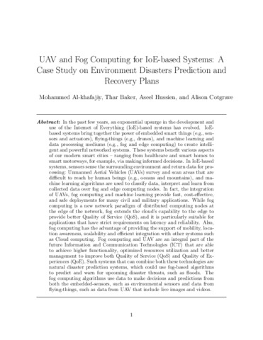 Al-Khafajiy, M. orcid id iconORCID: https://orcid.org/0000-0001-6561-0414, Baker, T., Hussien, A. and Cotgrave, A. (2020) UAV and fog computing for IoE-based systems: a case study on environment disasters prediction and recovery plans. In: Al-Turjman, F. (ed.) Unmanned aerial vehicles in smart cities. Unmanned system technologies. Springer, Cham, pp. 133-152. ISBN 9783030387112 doi: 10.1007/978-3-030-38712-9_8