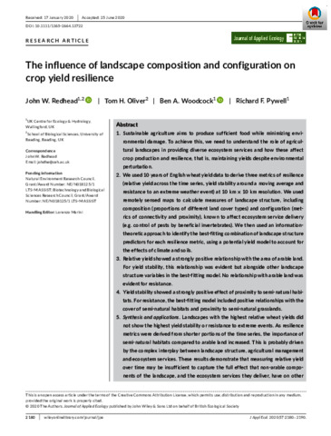 1. Sustainable agriculture aims to produce sufficient food while minimizing environmental damage. To achieve this, we need to understand the role of agricultural landscapes in providing diverse ecosystem services and how these affect crop production and resilience, that is, maintaining yields despite environmental perturbation. We used 10 years of English wheat yield data to derive three metrics of resilience (relative yield across the time series, yield stability around a moving average and resistance to an extreme weather event) at 10 km × 10 km resolution. We used remotely sensed maps to calculate measures of landscape structure, including composition (proportions of different land cover types) and configuration (metrics of connectivity and proximity), known to affect ecosystem service delivery (e.g. control of pests by beneficial invertebrates). We then used an information‐theoretic approach to identify the best‐fitting combination of landscape structure predictors for each resilience metric, using a potential yield model to account for the effects of climate and soils. Relative yield showed a strongly positive relationship with the area of arable land. For yield stability, this relationship was evident but alongside other landscape structure variables in the best‐fitting model. No relationship with arable land was evident for resistance. Yield stability showed a strongly positive effect of proximity to semi‐natural habitats. For resistance, the best‐fitting model included positive relationships with the cover of semi‐natural habitats and proximity to semi‐natural grasslands. Synthesis and applications. Landscapes with the highest relative wheat yields did not show the highest yield stability or resistance to extreme events. As resilience metrics were derived from shorter portions of the time series, the importance of semi‐natural habitats compared to arable land increased. This is probably driven by the complex interplay between landscape structure, agricultural management and ecosystem services. These results demonstrate that measuring relative yield over time may be insufficient to capture the full effect that non‐arable components of the landscape, and the ecosystem services they deliver, have on other aspects of resilience, and that there are clear trade‐offs in managing agricultural landscapes to maximize different aspects of crop yield resilience.