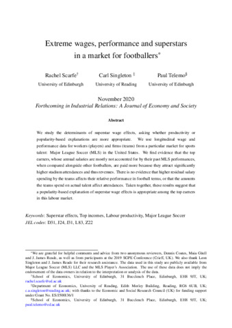 • Carrieri, V., F. Principe, and M. Raitano. 2018. “What makes you ‘super-rich’? New evidence from an analysis of football players’ wages.” Oxford Economic Papers, 70(4): 950–973.