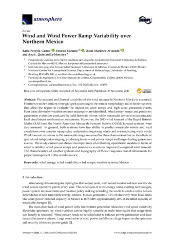 The seasonal and diurnal variability of the wind resource in Northern Mexico is examined. Fourteen weather stations were grouped according to the terrain morphology and weather systems that affect the region to evaluate the impact on wind ramps and high wind persistent events. Four areas driven by weather systems seasonality are identified. Wind power ramps and persistent generation events are produced by cold fronts in winter, while mesoscale convective systems and local circulations are dominant in summer. Moreover, the 2013 wind forecast of the RAP and NAM forecast systems were also assessed. In general both systems have less skill to predict mesoscale events and local circulations over complex topography, underestimating strong winds and overestimating weak winds. Wind forecast variations in the mesoscale range are smoother than observations due to effects of spatial and temporal averaging, producing fewer wind power ramps and longer lasting generation events. The study carried out shows the importance of evaluating operational models in terms of wind variability, wind power ramps and persistence events to improve the regional wind forecast. The characteristics of weather systems and topography of Mexico requires model refinements for proper management of the wind resource.