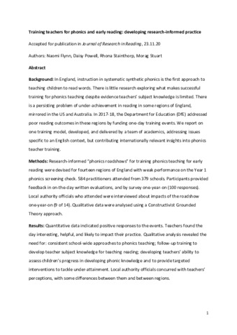 Flynn, N. orcid id iconORCID: https://orcid.org/0000-0002-3710-9910, Powell, D. orcid id iconORCID: https://orcid.org/0000-0002-3607-2407, Stainthorp, R. and Stuart, M. (2021) Training teachers for phonics and early reading: developing research-informed practice. Journal of Research in Reading, 44 (2). pp. 301-318. ISSN 1467-9817 doi: 10.1111/1467-9817.12336