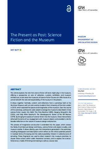 This article explores the role that science fiction (sf) texts might play in the museum, offering a perspective on acts of collection, curation, exhibition, and museum architecture, to ask what the museums of science fiction futures can offer those of us concerned with the role and responsibility of the museum in the present. It draws together methods, content and reflections from a workshop held at the Horniman Museum with art and curation students from University of the Arts London in 2019, which explored the spaces and imaginaries of the museum. Over the course of this workshop, participants were asked to restage the museums described in three science fiction novels: H.G. Wells’ The Time Machine (1895), Yevgeny Zamyatin’s We (1924), and Sally Miller Gearhart’s The Wanderground: Stories of the Hill Women (1979). By bringing the spaces of science fiction into the museum, these interventions reframed the terms of our engagement with museum objects and provided a site for broader reflection on the nature of museum design and practice. This process of imaginative construction is extended into this paper, which crosses the fields of architectural design and theory, science fiction and utopian studies, and museum studies. It draws directly upon the interventions generated in the workshop, including photographs and descriptions which reflect on the critical potential present in multiple forms of knowing and the radical possibility inherent in collective acts of remaking. These fragments are used to direct research into museum practices, to situate these actions within wider theoretical contexts, and to explore the science-fictional as a mode of thinking and making as well as a source text.